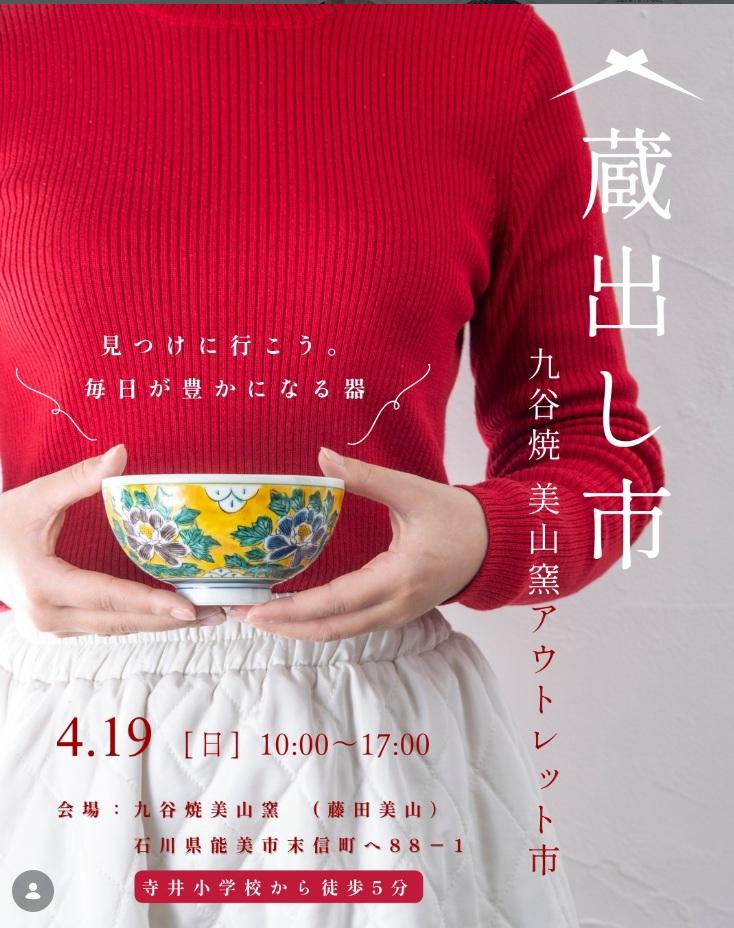 2026年4月19日、九谷焼美山窯藤田美山(能美市末信町へ88-1)にて「美山窯 蔵出し市」が開催されます。 宝探しのようにお気に入りのうつわと出会おう 九谷焼美山窯が初イベント「蔵出し市」が開催されます。倉庫に眠る一点ものの器や、少し個体差がある器、試作品などのアウトレット品、また日常使いしやすい品など、普段表に出ていない器が大放出!まるで宝探しのような、毎日の暮らしを彩る器との出会いを楽しんで。会場は九谷焼絵付け窯元の倉庫を開放。コーヒー、焼き菓子、軽食などの飲食ブースも出店されるので、のんびりとした一日が過ごせます。 入場無料。開催時間は10時から17時までです。一部コーナーは予約が必要なので詳細は公式アカウントを確認してください。