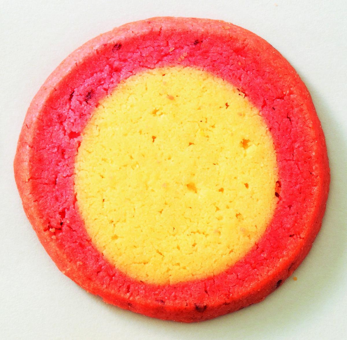 プレーン生地を苺入りの甘酸っぱい生地で包んだクッキーです。苺香料を使っています。