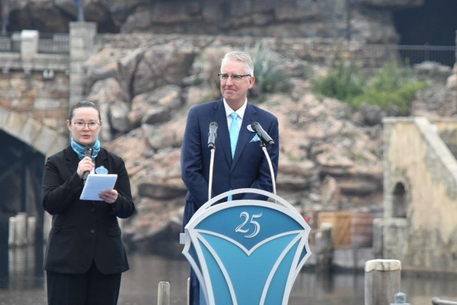 「これからも皆さまの心の中に冒険とイマジネーションの海が輝き続けますように。ジュビリーブルーにきらめく海へと出航しましょう。『東京ディズニーシー25周年"スパークリング・ジュビリー"』開幕です!」と祝祭の開幕を宣言。