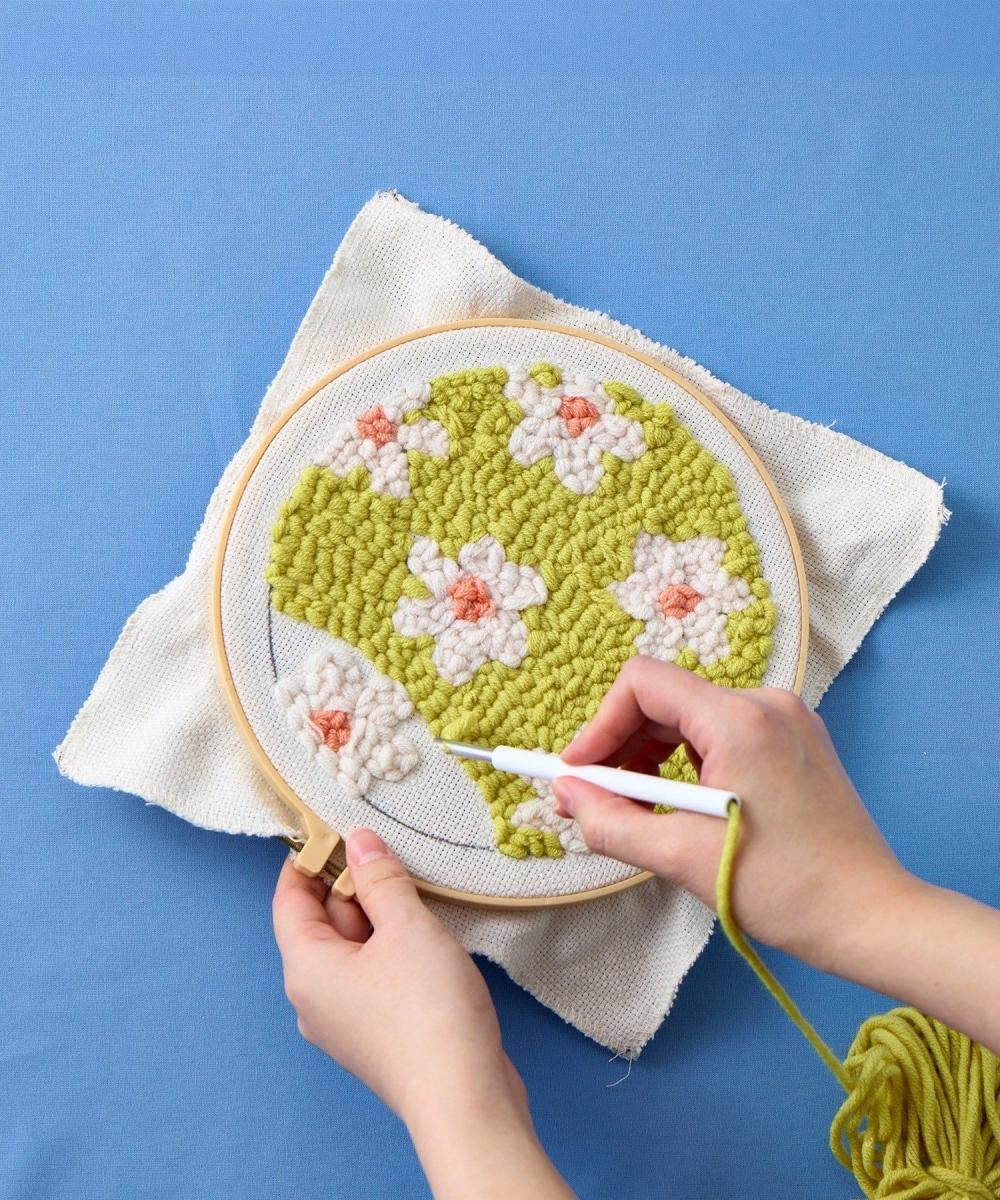 ふわふわの毛糸を布に刺して模様を作るパンチニードルです。セットには布、毛糸、刺繍枠、専用ニードルまで入っているので、買ってすぐに作業できるのがうれしいところ。デザインはフラワーとバタフライの2種類あります。もこもことした立体感がかわいく、完成した作品は壁に飾ったり、小物置きのアクセントにしたりして楽しめますよ。
