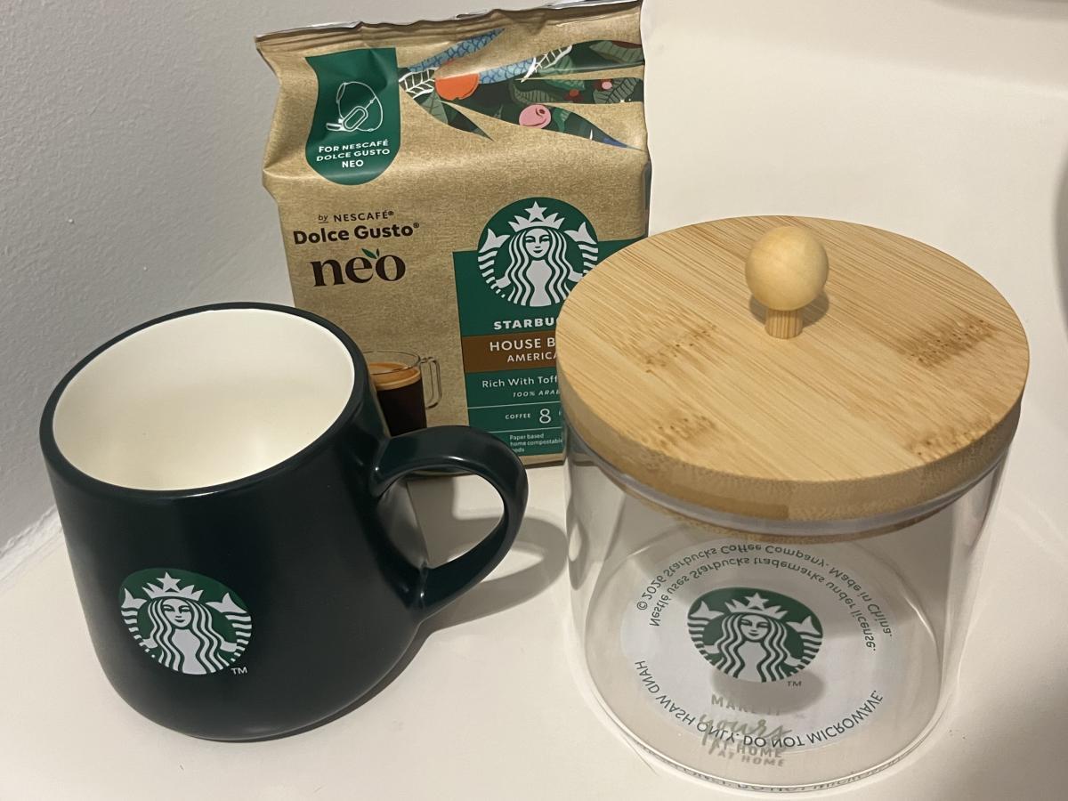 「ネスカフェ ドルチェ グスト ネオ カフェ シェア おうちでスターバックス セット ポッド付き」のセット内容は下記の通り。 ・ネスカフェ ドルチェ グスト ネオ カフェ シェア 1 台 ・スターバックス キャニスター 1 個 ・スターバックス マグカップ 1 個 ・「ネスカフェ ドルチェ グスト ネオ」専用コーヒーポッド スターバックス ハウス ブレンド 1袋(12個入り)