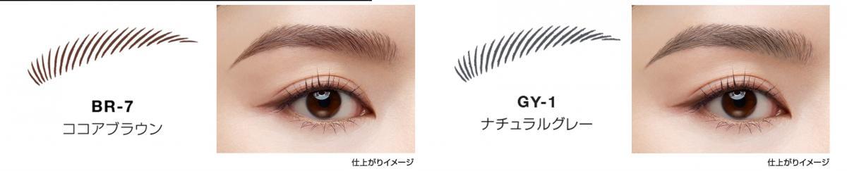 画像左の「BR-7 ココアブラウン」は、温かみを感じるブラウンカラーで自然な陰影に。画像右の「GY-1 ナチュラルグレー」は、落ち着いた印象のグレーカラーで、黒髪にも合う色味です。