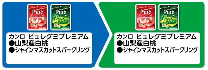 2個目の対象商品は、カンロ「ピュレグミプレミアム」の「山梨産白桃」「シャインマスカットスパークリング」。