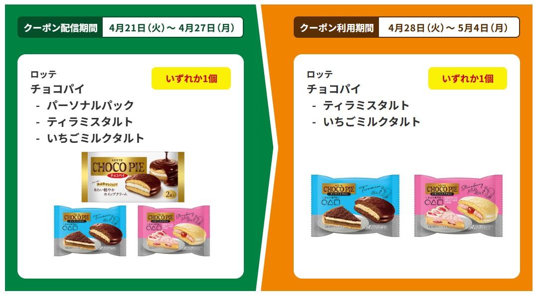 対象商品は、ロッテ「チョコパイ」の「パーソナルパック」「ティラミスタルト」「いちごミルクタルト」。