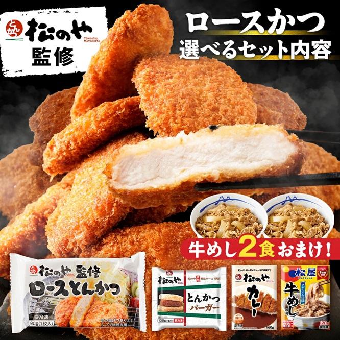 このほか「ロースかつ12食 & 松のやカレー12食」「ロースかつ20食 & かつバーガー4食」「ロースかつ8食 & 牛めし8食 & 松のやカレー8食」も、さらにおまけで牛めしが2食付いてきます。いずれも同価格なので、4種から好きな内容を選んで。