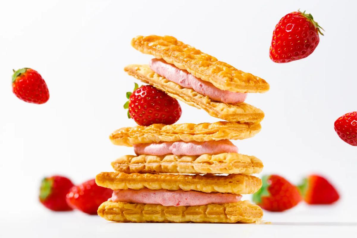 サクサクのパイ生地に、甘酸っぱいイチゴクリームをサンド。さらにイチゴクランチのカリッとした食感が加わり、いちごの魅力を存分に味わえるスイーツです。