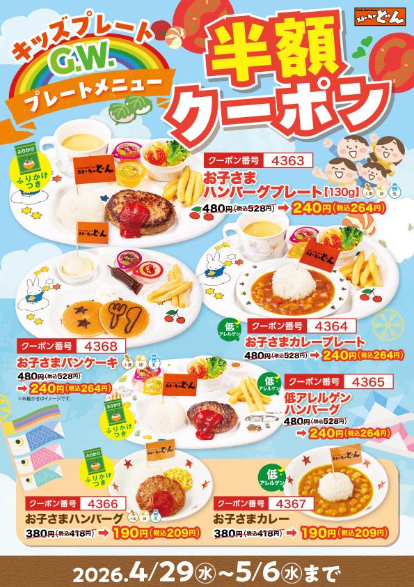 アークミールが運営するステーキのどんは、2026年4月29日から5月6日まで「お子さまメニュー半額クーポン祭り」を開催しています。低アレルゲンプレートも対象 4月29日から5月6日までの期間中は、WEB上で配布されているクーポンを提示すると、対象のキッズメニューが半額に。 「お子様ハンバーグプレート」「お子様パンケーキ」「お子様カレープレート」「低アレルゲンプレート」は通常価格528円から264円、「お子様ハンバーグ」「お子様カレー」は通常価格418円から209円になります。 クーポンは期間中何度でも利用可能なので、ゴールデンウィークの家族での外食を気軽に楽しめる企画です。 対象は小学生以下のみで、店内飲食かつ本人の注文限定です。 詳しくは、公式サイトから確認できます。 ※価格はすべて税込です。 東京バーゲンマニア編集部