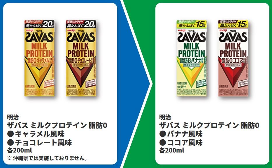 3つめの対象商品は、明治「ザバス ミルクプロテイン 脂肪0」の「キャラメル風味」「チョコレート風味」(各200ml)です。