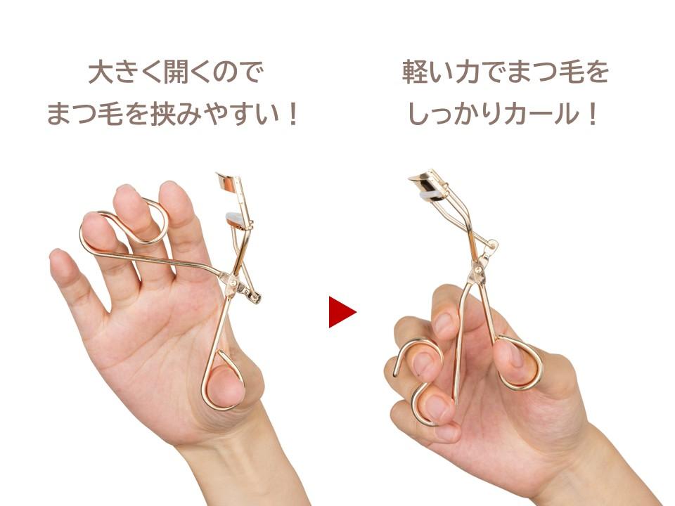 広い可動域を確保しているため、まつ毛全体をスムーズにとらえて、軽い力でもしっかりカールを作れるのが大きな特徴です。